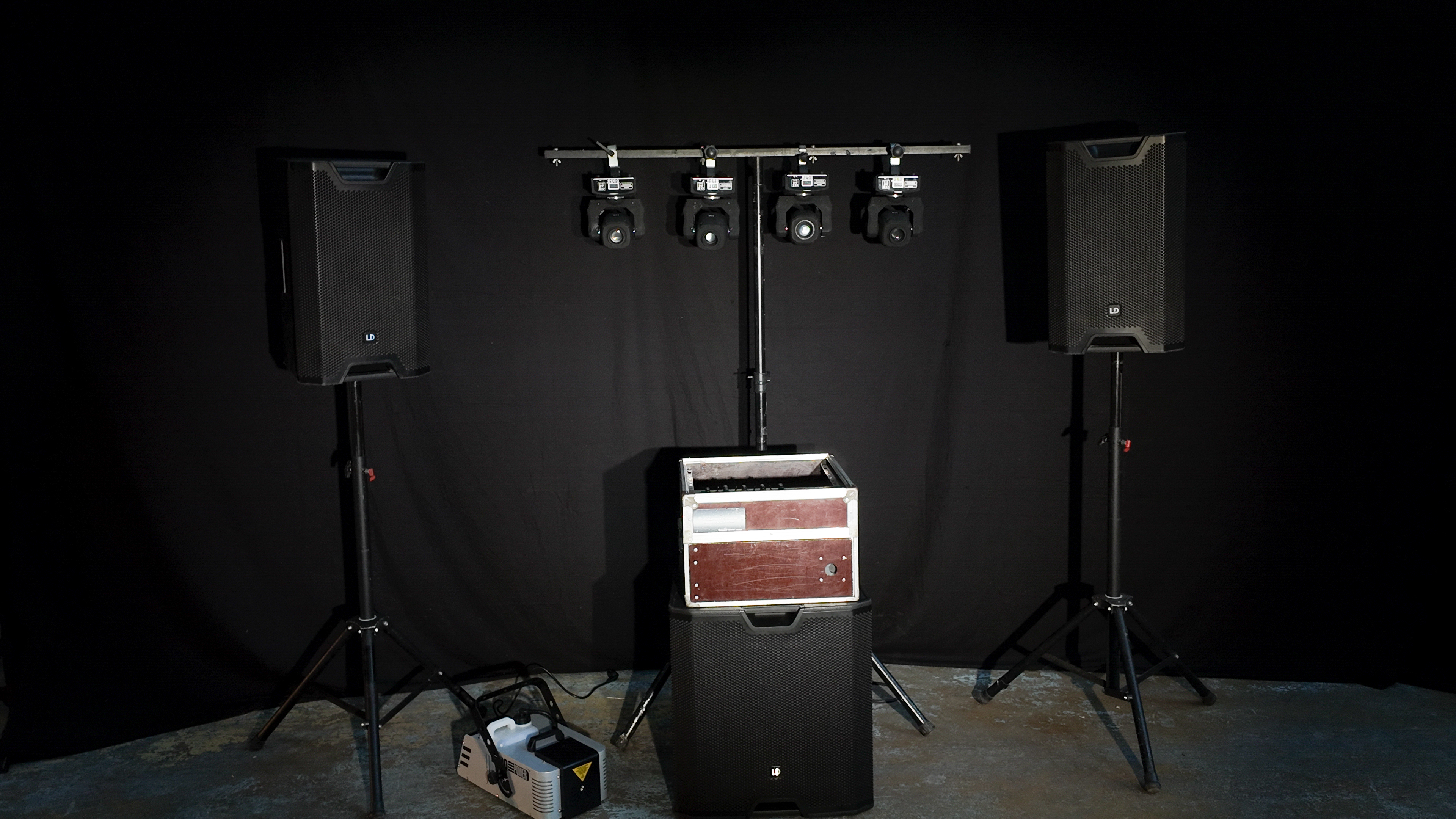 2 enceintes amplifiées LD système ICOA15, Un Sub LD système, Une table de mixage jb , Un câble pour raccorder un ordinateur (mini jack), Un câblage complet, Un Fly caisse de transport, 2 pieds d’enceintes, 1 Pied d’éclairage, 4 lyres à effets 60W, 1 Machine à fumée.