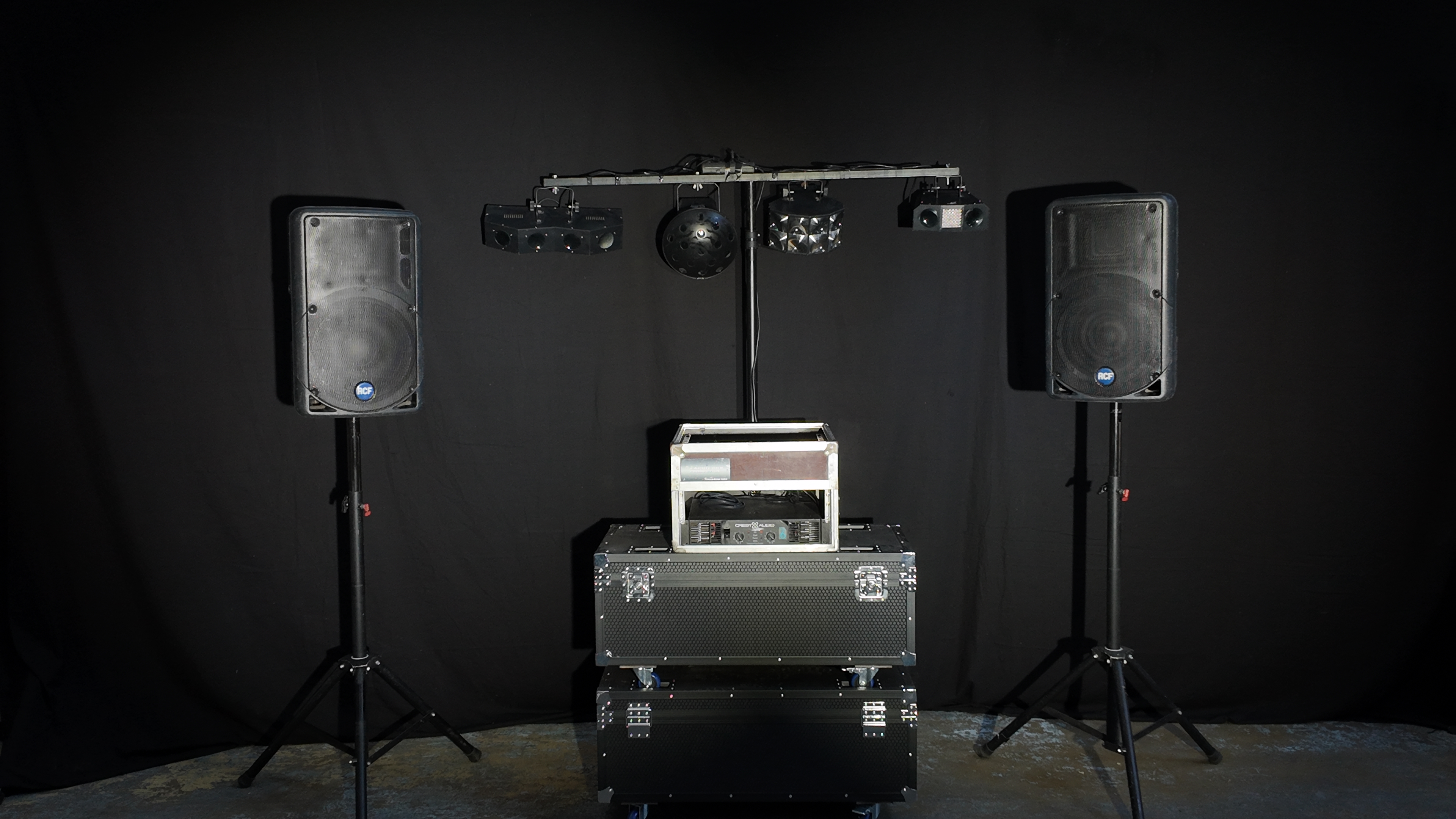 2 enceintes RCF 325i, Un amplificateur CrestAudio CA6, Une table de mixage jb , Un câble pour raccorder un ordinateur (mini jack), Un câblage complet, Un Fly caisse de transport, 2 pieds d’enceintes, 4 effets lumières, 1 Pied d’éclairage.